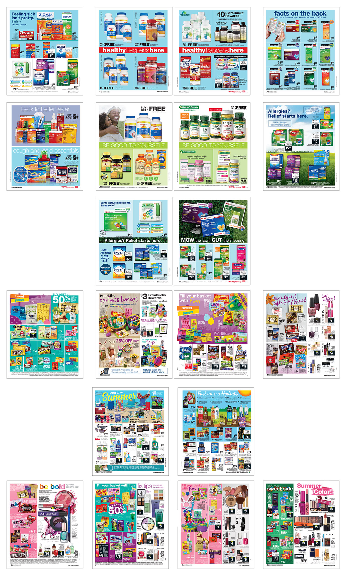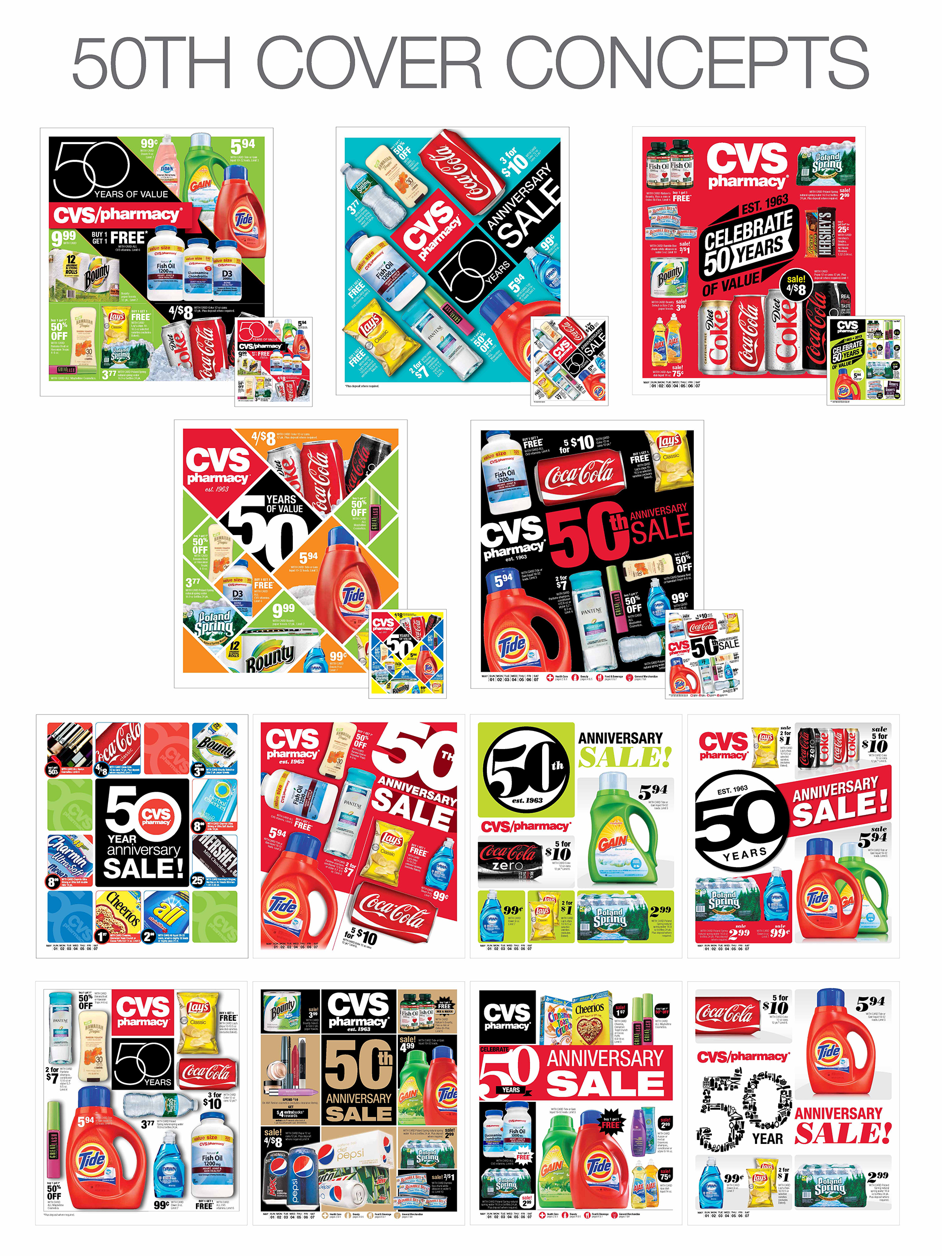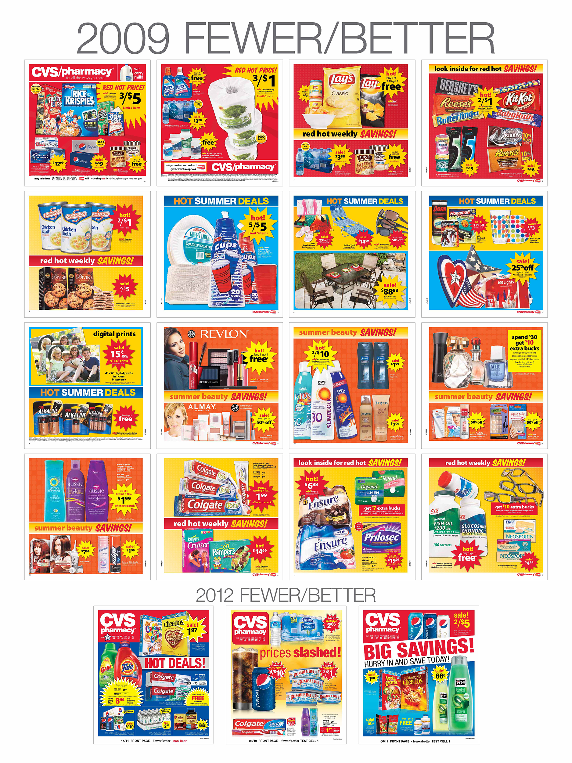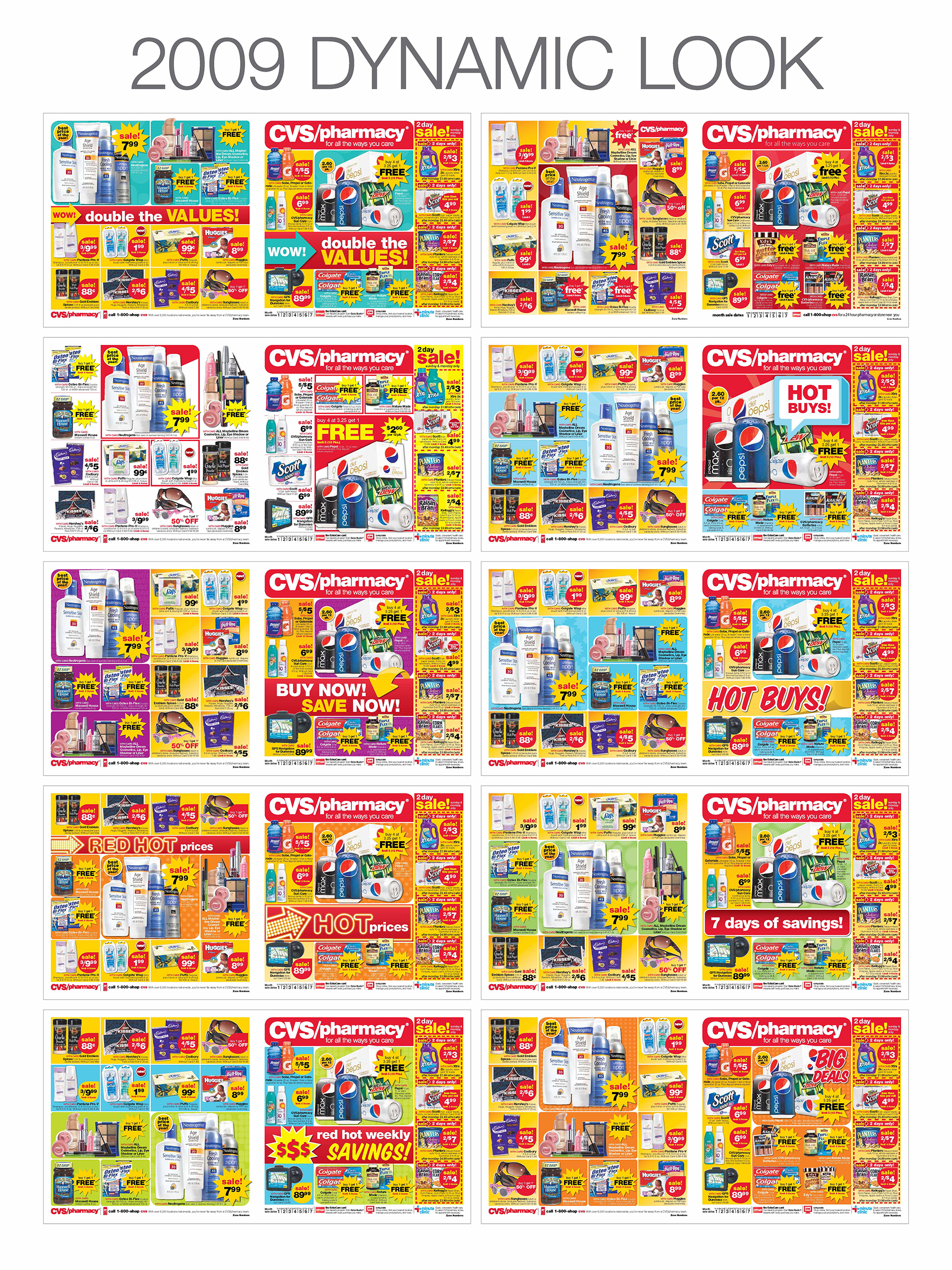 For the majority of years at CVS, the circular was the #1 sales driving vehicle. The majority of the advertising spend was devoted to the weekly ad. This piece of creative was reviewed weekly by the EVP of CVS because of its sales driving significance. With such high visibility the circular was held to the highest standards in promotional value, ad accuracy and creative presence. With this being said, the weekly ad went through many tests through the years to increase visibility, productivity and to drive more sales. As a creative team we could have treated this like your every day circular and just filled it block by block with pricing and product images, but we wanted to take it further. With the right photography, layout, graphics and color we knew we could make this stand out as one of the best weekly ads out there in circulation.